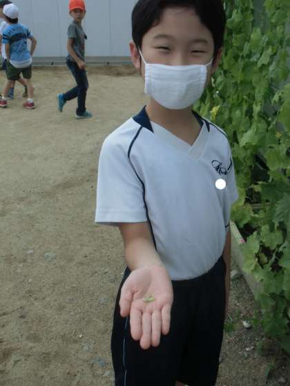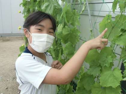 見て!(4年生) 公開日 2020/07/22 更新日 2020/07/22 4年生 「ほら、ここ!もうすぐ実がなりそうだよ」 「水に浸した種から根が出てきたよ。今から土に植えるんだ」 ヘチマの成長を嬉しそうに見せてくれる子どもたちです。