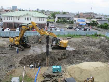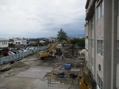 下の写真は、2階なかよし級横廊下から撮影しました。深い穴を掘って杭抜き作業が進められています。大量の水が出ているそうです。