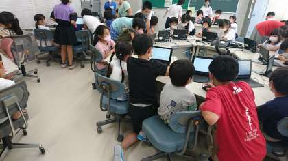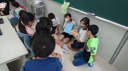 1年生が、コンピュータを用いて「生活調査アンケート」をするために、使い方をサポートしました。質問項目が難しいときは、質問内容をかみ砕いて説明して、一人一人が1年生の役に立てました。また、時間が余ったので、図書室で事前に借りておいた本の読み聞かせを行いました。相手意識をもった本のもち方、視線、読むスピードを工夫する姿が見られ、高学年としての意識を更に高めています。
