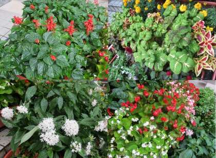 左上から、時計回りに、「サルビア」「コリウス」「ベコニア」「ペンタス」です。