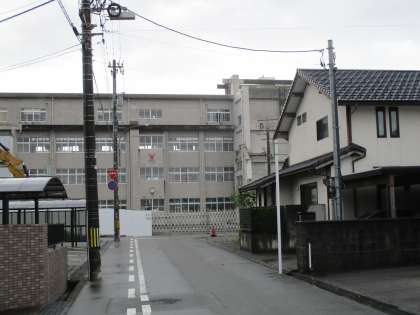 下が「いま」の写真です。そうです。堀川小泉町1丁目公園から少し学校に向かったところのから撮影した学校です。今では、学校の周りは多くの建物に囲まれていますが、昔は、田んぼや畑などに囲まれていたんですね。