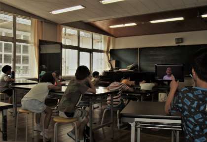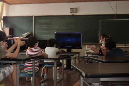 転入生紹介や、夏休みの取組と2学期に向けての目当て紹介を、パソコンの動画と放送で見たり聞いたりもしました。
