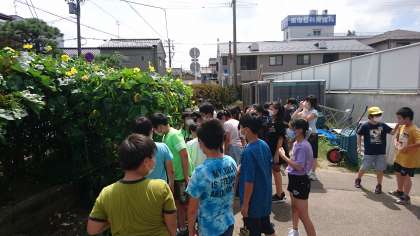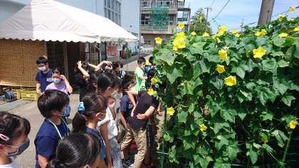 下校前に実際にヘチマを観察しに行くと、思っていた以上に生い茂る様子を見て、植物の生命の強さを感じつつ、理科の学習への興味をもつ子どもたちでした。