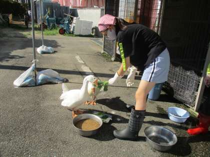 ガガとピピは小松菜が大好きです。飼育当番が小松菜を差し出すと、ガーガー、美味しそうについばんでいます。