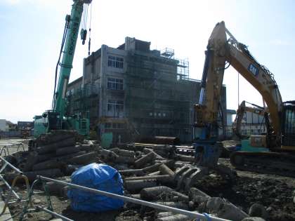1枚目は、ちょっと暗いですが、旧駐車場跡から見た既存校舎です。掘り出された杭が積み重ねられています。