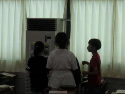 社会科の学習で、学校で備えているものを探しました。教室のエアコンに転倒防止の留め金具がついているのを見つけて「こんな身近にあったんだ!」と驚いた様子。学校には自分たちを災害から守るための備えがたくさんあることに気付いた子どもたちでした。