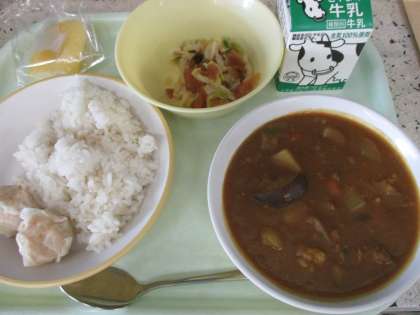 今日は「夏野菜カレー」でした。夏野菜は、夏にとれる野菜で強い日差しを浴びた、ビタミン、ミネラルがたっぷりの野菜のことです。今日の「夏野菜カレー」にはピーマン、トマト、なす、ズッキーニが入っています。