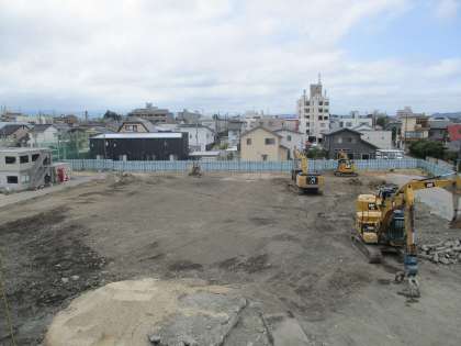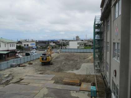 下の写真は、西棟校舎跡です。掘り出された杭は、ほとんど撤去され、地面も綺麗に整地されています。敷地西側の木が伐採され、敷地と隣接民家を仕切るアルミフェンスが設置される予定です。