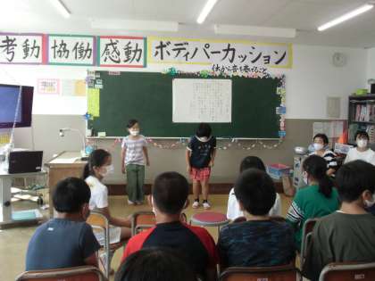 9月2日(水)に行われる、「こんにちは集会」のリハーサルを行いました。5年1組のクラス紹介は、ボディパーカッションの演奏です。立候補したチームのボディパーカッションが次々と、演奏され、教室の中に拍手が広がりました。