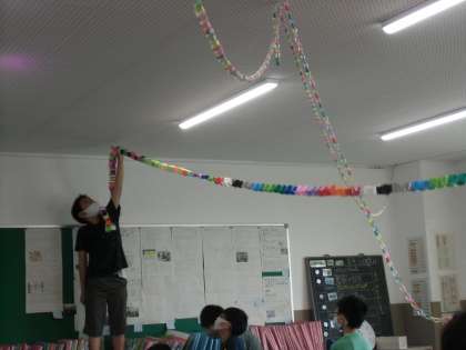 教生先生への質問タイムとすごろくゲームを組み合わせた交流ゲームもあります。また、クラスのことをもっと楽しく知らせたいと、「すご技ショー」で手品を披露してくれる人もいます。これから始まる教育実習で出会う最初の集会を、特別な気持ちで迎えようと、飾り付けにも力が入っているようです。