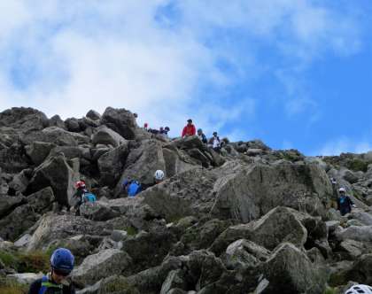 立山登山の思い出(下山) 公開日 2020/09/01 更新日 2020/09/01 6年生 せっかく登った雄山ですが、天気が崩れる前に下山します。 今登ってきたところを、今度は下ります。登りの大変さや、途中に越えてきた大きな岩の存在を知っている子どもたちの顔には、緊張感が浮かんでいました。 一歩ずつ慎重に下りる子どもたちを応援するかのように、途中から真っ白なガスが薄れ、青空まで顔を出し始めました。
