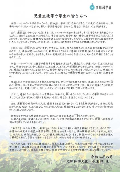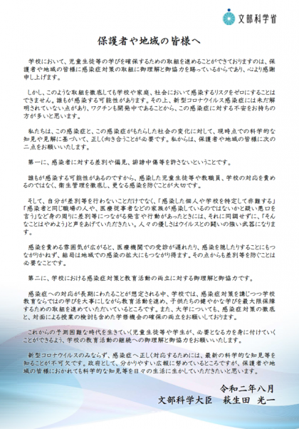 新型コロナウイルス感染症に関する差別や偏見の防止に向けた文部科学大臣からのメッセージが届いています。学校では日頃から新型コロナウイルス感染症に関する正しい知識を基に、発達段階に応じて指導や対策を行っていますが、引き続き子どもたちが新型コロナウイルス感染症を正しく理解し、差別や偏見、誹謗中傷等を生まないよう指導していきます。