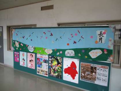 9月になり掲示板が変わりました。トンボにコスモス等々。暑い中で秋を感じることができる掲示板です。