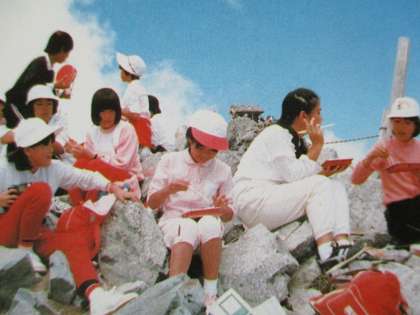 2枚目の写真は、山頂で弁当を食べている様子です。後ろに小さく雄山山頂が見えますね。