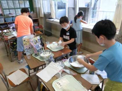 理科の学習で「物の重さ」について考えています。砂糖や塩の重さを比べながら実験しています。
