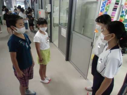 赤団では、中学年のリーダーとなる4年生の団長、副団長を決めました。今日は、6年生の団長、副団長にあいさつに行きました。「中学年のリーダーとして赤団をまとめ、引っ張って行きます」と約束しました。スポーツウィークに向けての準備は万全です!
