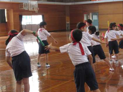 去年、リレーの選手だった子どもたちが積極的に声をかけ、バトンパスの方法を教えていました。