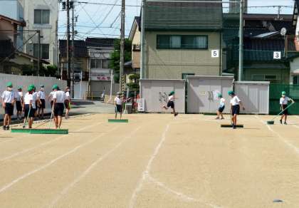 三つの団の結団式が終わった後のグラウンドには、6年生たちが黙々とブラシをかける姿がありました。誰一人「疲れた」と言うことなく、結団式で使ったグラウンド一面を手分けして整えていました。