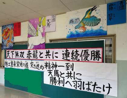 昼休憩に東玄関横の掲示板に、各団のスローガンとマスコットを掲示しました。貼り終わった後、自分たちのスローガンやマスコットを見つめる6年生の表情は、なんとなく誇らしげに見えました。