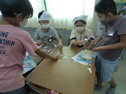 外国語活動の時間、新しく習った英語表現「What do you want?」を使って、食材を調達し、オリジナルのピザ作りを行いました。今日はピザ作りの前半。個性豊かなピザが出来上がりそうです。