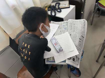 算数科「およその数」の学習において、自宅から最近の新聞紙を持ってきて、隅々まで読んでいます。およその数の使われ方の違いについて感じていたのでしょうか、時間いっぱい取り組んでいました。
