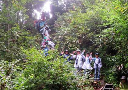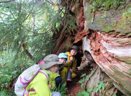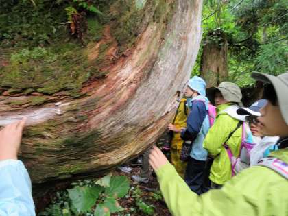 高原バスが通る舗装道路から一歩森の中へ入ると、全く違った光景が広がっており、立山杉とブナの原生林の中を進むにつれ、「すごく太い立山杉だ」「この木の曲がり方、すごいなあ」と子どもたちは歓声を上げていました。