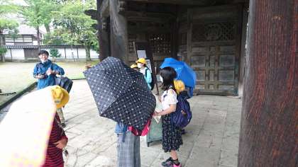 井波のまちに校外学習に行ってきました。当日は小雨が降る中、ファミリーで計画を立てた行程で、待ち歩きを行いました。井波は彫刻の街であるため、子どもたちは、様々な場所で木で作られた作品を目にしたり、歴史のある瑞泉寺を見学し、富山市とは異なる文化や環境のよさを感じていました。