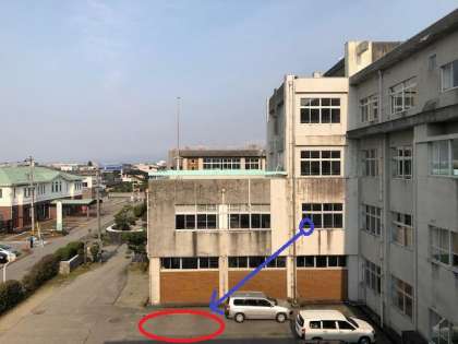 下の写真を見てください。この写真は、今年の4月に西棟6年プレイルームから、東側の中央棟を撮影した様子です。上の写真は、青い○の窓から、赤い○部分を撮しました。 そうです。地面を掘っている部分は、駐車場だったんです。この駐車場の下に大きな空洞(部屋)が4カ所あったようです。何のために作られ、そしてどのようなことに使われていたのでしょうね。