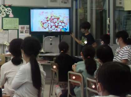 外国語活動の時間、前時までに作ったオリジナルピザを英語で紹介しました。個性の表れたピザはどれも美味しそうでした。