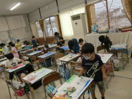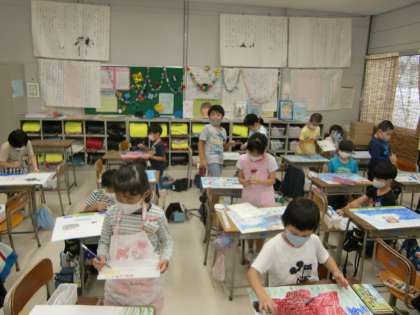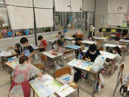 図画工作での姿(2年生) 公開日 2020/09/25 更新日 2020/09/25 2年生 「スイミー」のお話を読んで、心に残った場面を絵で表現しました。それぞれの海の中様子を水彩セットを用いて描くができました。