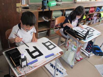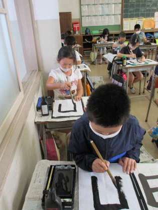 楽しみな書写(3年生) 公開日 2020/09/29 更新日 2020/09/29 3年生 子どもたちは書写をとても楽しみにしています。たくさん練習できるように休み時間に準備を済ませています。今日は、「日」を書きました。できた字を見ながら「ここが太すぎた」「字はうまく書けたけど、名前のはらいがうまくできなかった」など、仲間と話し合う姿が見られました。