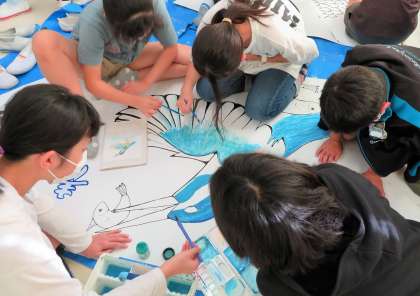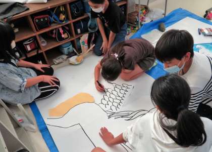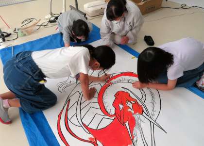 今日は、来週行われる「エール交換」の準備を行いました。自分たちの色団の士気を高めるために、どんなエールをしたらよいか応援団長を中心に考え、実際の動きと合わせて確認していました。また、マスコット・リーダーたちは、例年と比べて小さいサイズではあるものの、結団式で紹介したマスコットよりも大きなものを描いています。色団の仲間を少しでも応援する気持ちが伝わるように、一筆一筆丁寧に塗り進めていました。