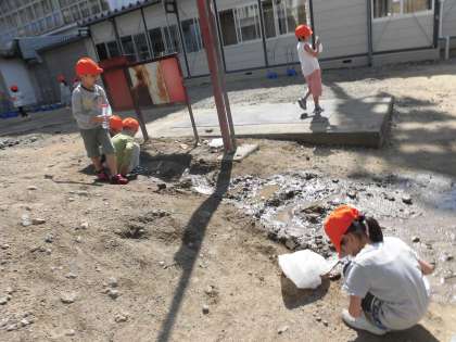 家からバケツとスコップを持ってきて川を作る子ども、マジックとシールを持ってきて石に絵を描く子ども、ケチャップ等の空き容器を持ってきて水鉄砲をする子ども。それぞれが自分で考えた遊びを、仲間と共に思い切り取り組みました。