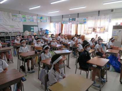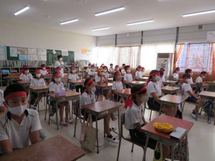今年度は、各教室で放送を聞きました。全校別々の場所での参加となりましたが、体育服を着て、所属する色団のハチマキを結ぶことで、自分の所属する団の仲間と心をつなぐ子どもたちでした。