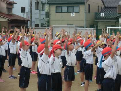 今日は、ラジオ体操と100m走を行いました。みんな、夢中になって取り組んでいました。