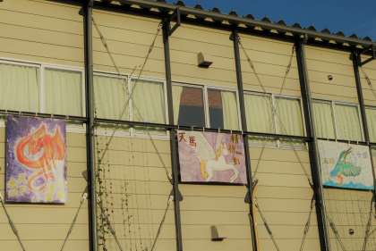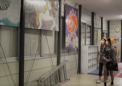 仮設校舎の外壁に掲示したマスコットが、今週1週間、堀川小学校の子どもたちの雄姿を見守ります。