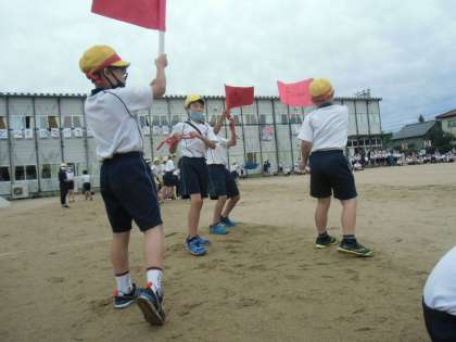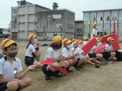 高学年の競技「大縄跳び」では、4年生が団席から力いっぱい応援しました。太鼓を叩いたり、旗を振ったりして、5・6年生さんに「ガンバレ!」の気持ちをおくりました。
