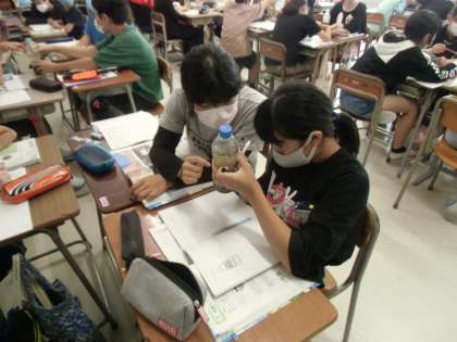 今日の理科の時間には、金曜日に集めてきた砂や土、小石などを入れ、よく振っておいたペットボトルの中の様子を観察しました。