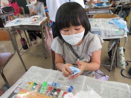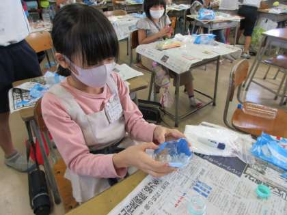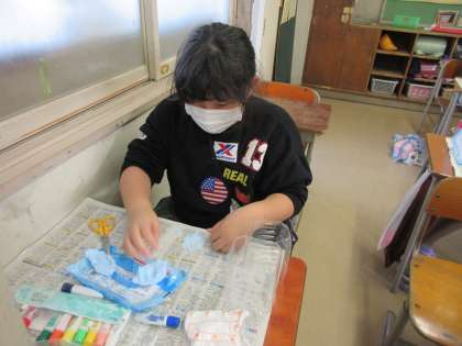 図画工作科「空きようきのへんしん」 公開日 2020/10/14 更新日 2020/10/14 3年生 紙粘土で空き容器を小物入れに変身させました。使う様子を思い浮かべながら材料を組み合わせを考えたり、紙粘土の感触や色付きを楽しみながら作ったりしました。
