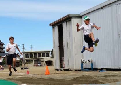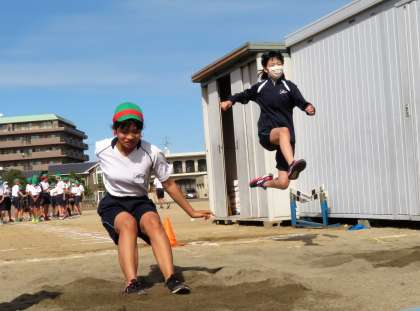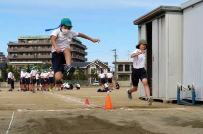 久しぶりの走り幅跳びに、はじめは戸惑っていた6年生の子どもたちですが、何度か練習するうちに思い出してきたようでした。踏切がぴったり合うと、気持ちよさそうに跳んでいました。
