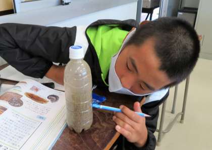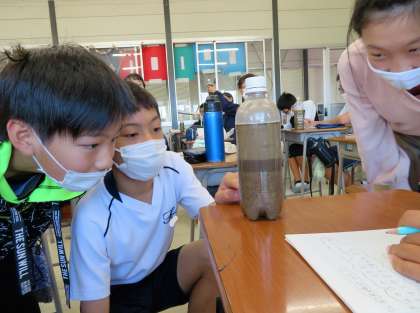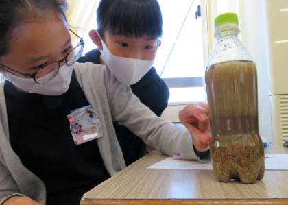 泥、砂、小石と3種類のつぶの大きさの土を集め、ペットボトルの中で混ぜた時の様子と、そこに水を入れて混ぜた時の様子を観察しました。水を入れると、大きいつぶのものから下にたまり、少しずつ層が現れてくる様子を観察し、「すごい!地層みたいになった」「家でもやってみたいな」と興奮気味に話す子どもたち。やっぱり、実際に見て触れると、心が動きますね。