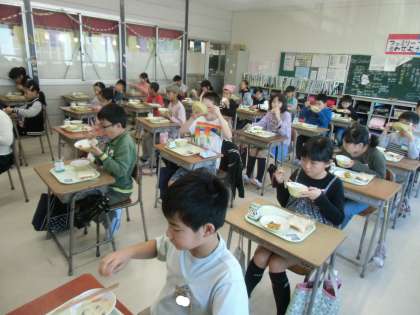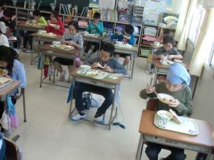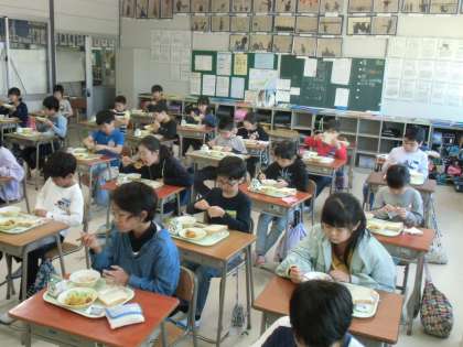 今日は就学時健康診断のため、子どもたちは11時20分から給食準備を始めました。通常より1時間も早いです。そのために、調理員さんはいつもより早く出勤され準備をしておられました。心を込められた給食、とても美味しくいただきました。ありがとうございました。