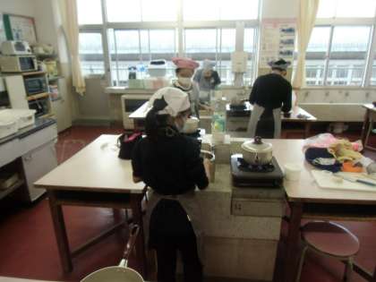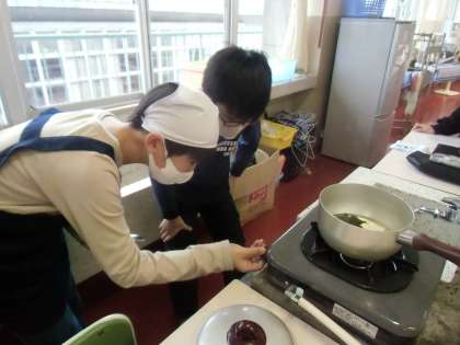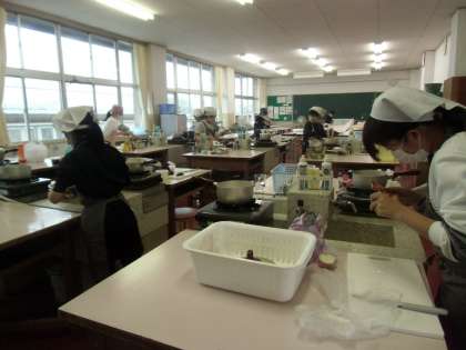 家庭科の学習で、味噌汁の調理実習を行いました。今回は、クラスを3つに分けて、一人一人が自分の味噌汁をつくる学習をしました。子どもたちは、「味噌汁」について調べ学習をした後、計画を立てて、土日に家庭で練習をし、具材を準備するなどして今日の学習に臨みました。だしの取り方を工夫する人、みそを合わせたり、こだわりのものを準備したりする人、栄養バランスを考えて具材を選んだ人など、それぞれの思いや意図をもった味噌汁ができあがりました。