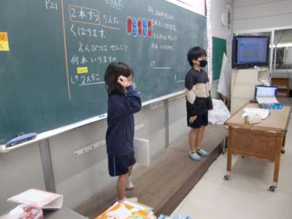 算数科の学習(2年生) 公開日 2020/10/26 更新日 2020/10/26 2年生 かけ算の2つの問題から式と答えをそれぞれ書いてくらべました。仲間と学習することで、「1つ分の数」×「いくつ分」=「ぜんぶの数」とかけ算の式の意味を見直すことができました。