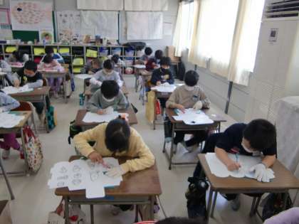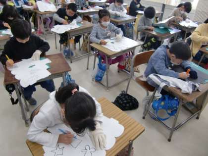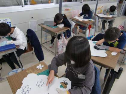 今日の図工の学習は、カッターを扱っての工作活動でした。切り抜きたい形を厚紙に描きました。みんな、安全に真剣に取り組んでいました。カッターの扱いも上手でした。