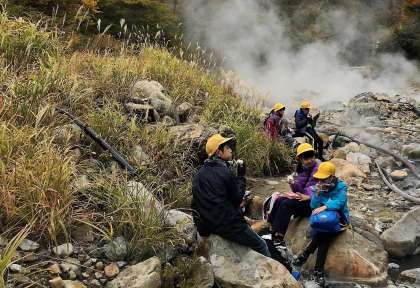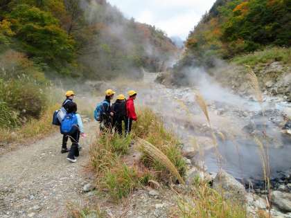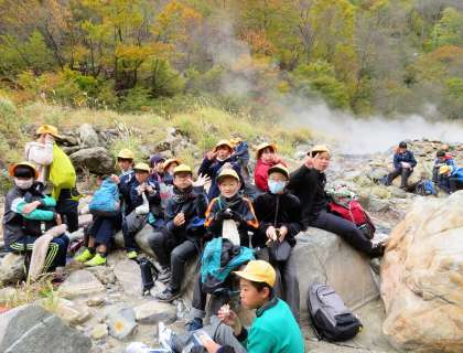 校外学習(6年生)その4 公開日 2020/10/31 更新日 2020/10/31 6年生 祖母谷地獄では、河原にある源泉を見学しました。冷えた体に温泉の湯気が温かく感じました。昼食は、湯煙に包まれた河原でいただきました。