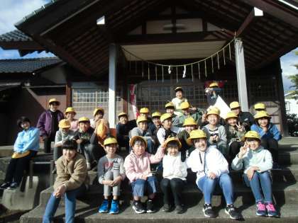 神明社に写生会にいきました。秋晴れの心地よい中、真剣に神明社を見つめながら、画用紙に鉛筆を入れる子どもの姿が見られました。休憩時間には、鬼ごっこをしたり、遊具で遊んだりして心をほぐしました。