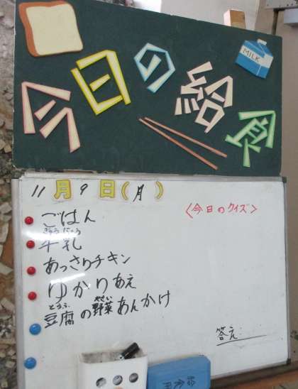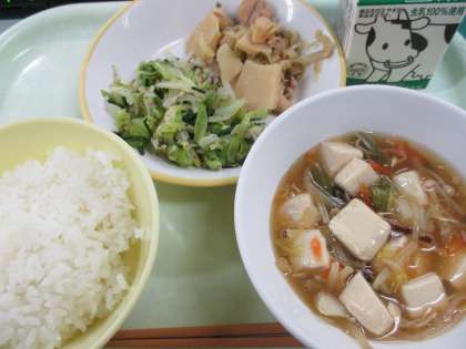 「豆腐の野菜あんかけ」には、「えのきたけ」が使われていました。「えのきたけ」は給食でよく使われます。。この「えのきたけ」は、きのこですが、さて「きのこ」は何の仲間になるでしょうか。きのこは、こうじやカビなどと同じ、菌の仲間です。「えのきたけ」は、きのこの中でも特に疲労回復に効果のあるビタミンB1がたくさん含まれています。