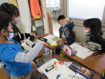 算数科の授業で、自作の天秤を使って物の重さを比べました。「重さは、手に持った感じでは分からないけど、天秤を使うと見た目で重さが分かるな」「AくんとBさんのはさみは、Aくんの方が重いな」など話しながら重さを確かめてる姿が見られました。