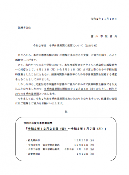冬期休業期間の変更について、富山市教育委員会から通知が届きました。本日、子どもたちを通して配付しましたので、ご確認ください。